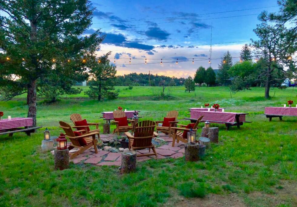 The Colorado Lodge, Barn, fire pit, and picnic area is the perfect location for your whole family to spend a few days or week together. Your family will create many lasting memories as you have your rehearsal dinner in the barn, your intimate wedding in the large backyard, or your family meals and post-nuptial brunch on the picnic tables on the covered wraparound porch. Later, you can gather around the fire pit to roast s'mores before retiring to the 7 bedrooms (6 have en-suite bathrooms).